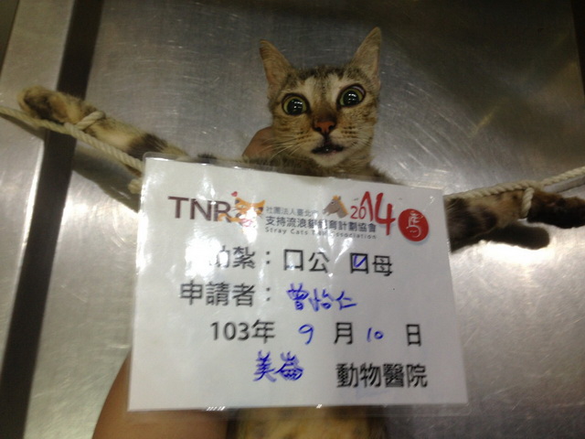 這隻虎斑貓叫花花,之前已經生過一胎了,戒心很重很難誘捕,好不容易這幾個月愛媽都有特別親近牠,終於順利誘捕成功了