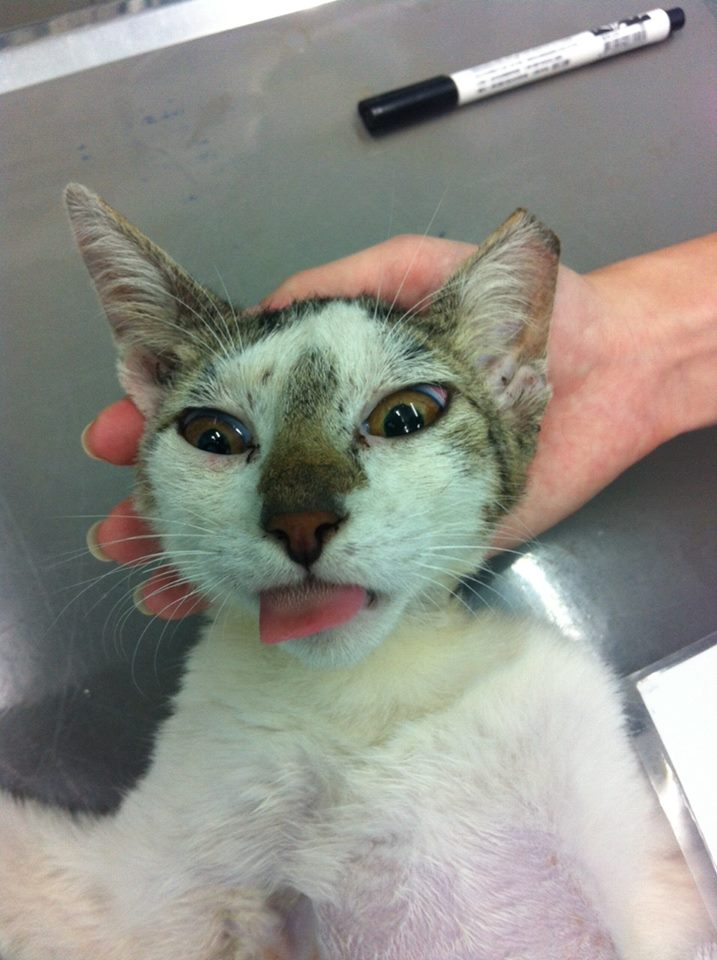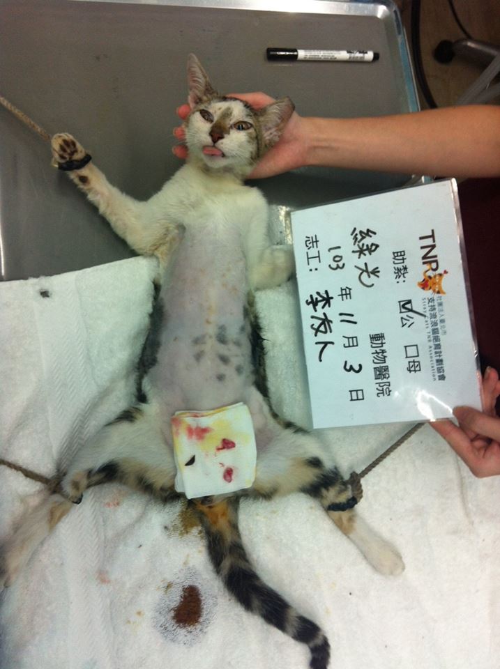 第一次TNR貓咪,這隻大概是我開始餵貓的第三代,脾氣很好,頗親人,本來以為第一次用誘捕籠,不小的會不會沒有用,想不到剛放下去沒有一分鐘,這隻笨貓就被籠子裡面的罐頭引誘進去,被抓的時候也是ㄧ臉茫然沒有很害怕