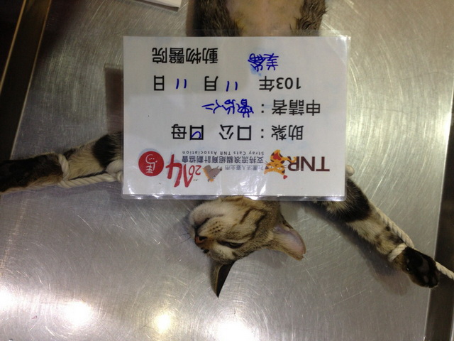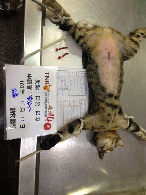 這隻虎斑叫小米,是從小就開始餵養的浪貓一窩四隻,用誘捕籠抓到,紮好原地放養