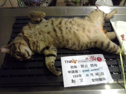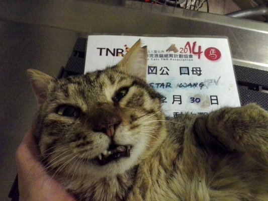 誘捕者暱稱: Star Wang 性別: 公 花色: 全虎斑 誘捕地點: 南寮收容所 結紮醫院: 新竺動物醫院 結紮費用: 800 助紮者: 已付款:Keith Yangx3 額外醫療費用申請: 特別說明與誘捕心情: 20141229自南寮收容所領出六隻成貓,