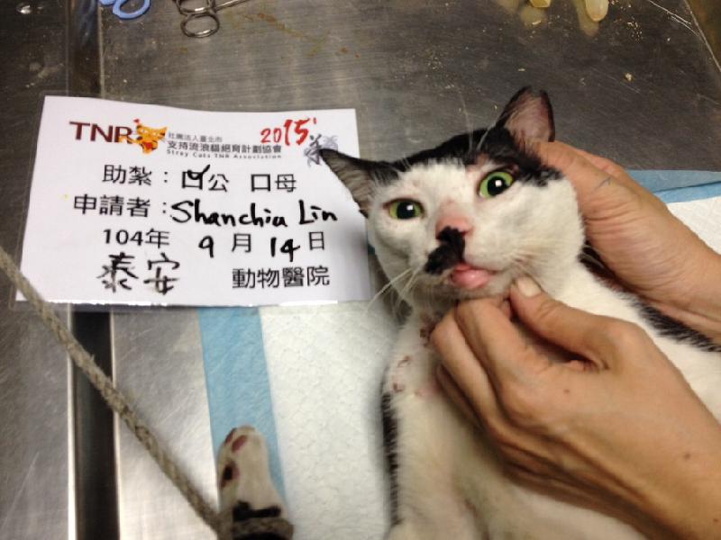 這隻黑白花色特別,長得很像戴軍帽的日本人,個性算穩重,不過其他紮過的貓會怕他,可能是體型大的關係,下巴有部分傷口,已結痂,看來戰鬥力不小,速速結紮去,維持和平為上策