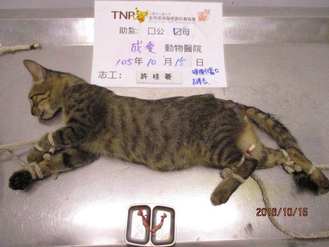 原志工中途街貓的租屋處附近之街貓群,此母貓已生育多胎,但緊覺性高,每每誘捕時機都錯過,等待多時終於能在未懷孕無哺乳的情況下誘捕成功!發現屁股尾端有個算深的傷口,順便縫合治療!