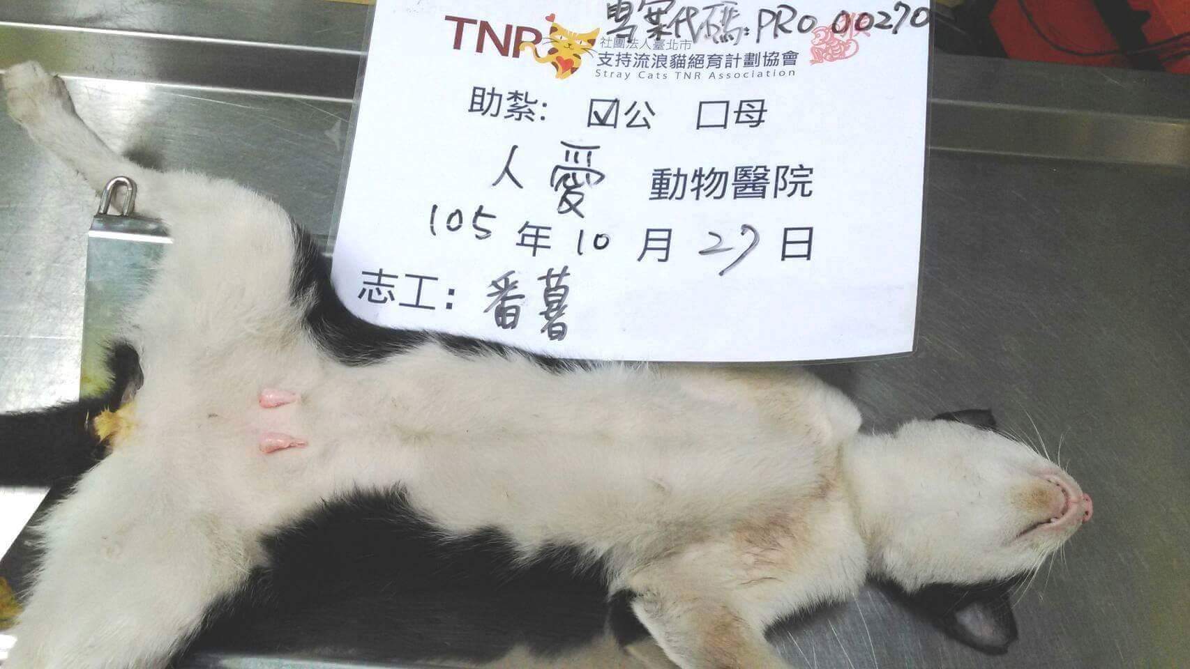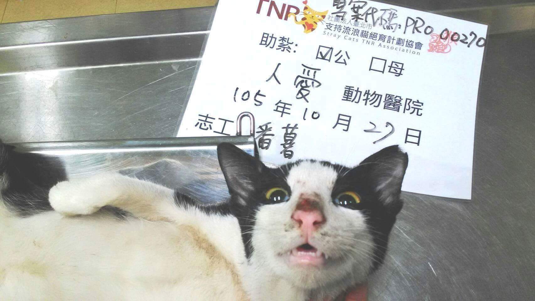 花色: 白底黑賓士貓 誘捕地點: 高雄市小港區港後路
