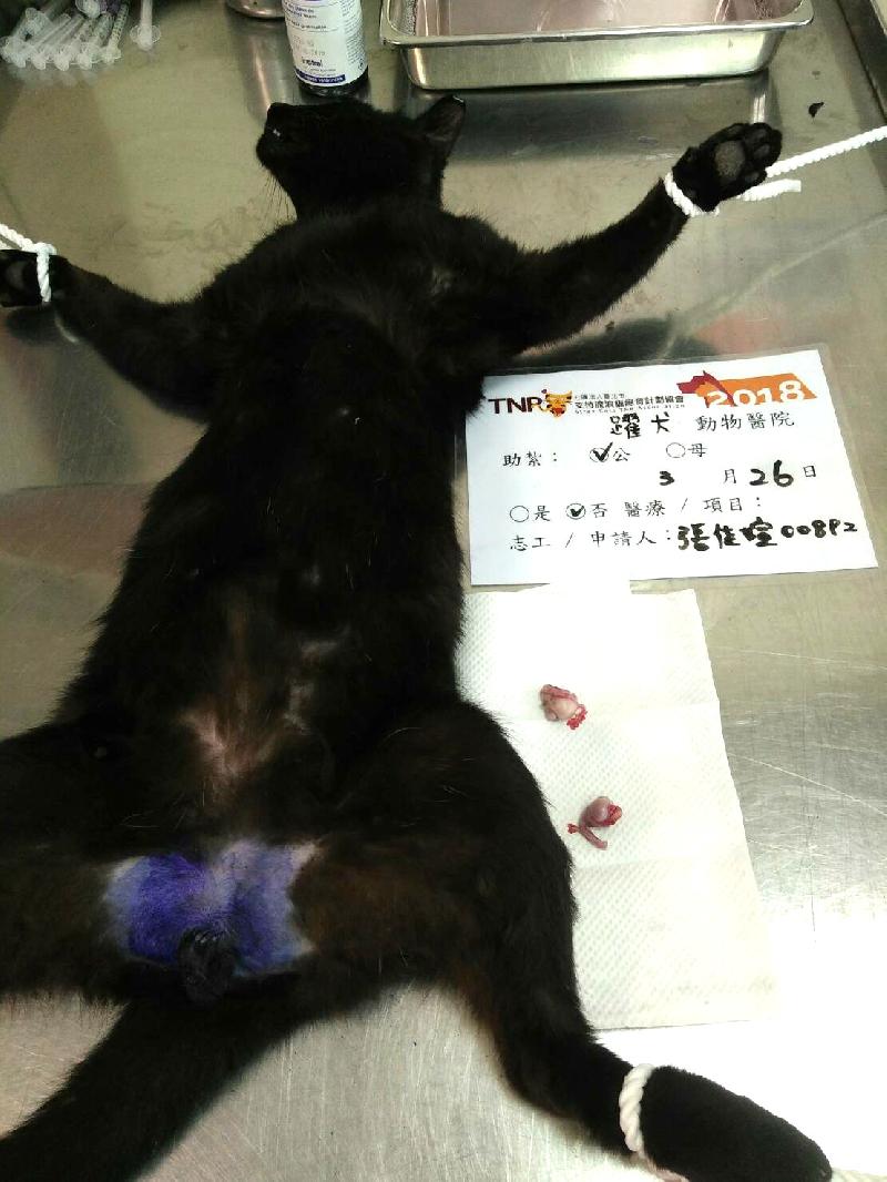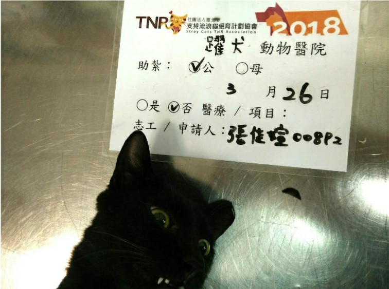 這隻黑黑是這半年來突然出現的,本來是想先抓母貓結紮,但近期發現黑黑很會搶地盤,且好像感冒了,呼吸不是很順暢,經躍犬醫院評估可結紮+投藥治療感冒,於是就決定抓黑黑,牠也很好抓,一下子就進籠了。