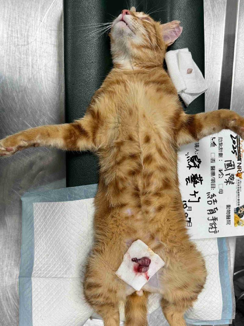誘捕者暱稱: 心滿藝竹 性別: 公 花色: 橘條紋,下巴白色 誘捕地點: 雲林縣莿桐鄉六合村東興46號 結紮醫院: 國際犬貓專科醫院 結紮費用: 1300 助紮者: 已付款:Queenax1, CHCx2, 蘇先生x4 額外醫療費用申請: 體重超過4KG,結紮費用要再加500元,附上醫院的費用明細 特別說明與誘捕心情: 這隻到動物醫院結紮的時候已經套上洗衣袋,在醫院有拍照但不是很清楚,只能用結紮前暫時安置於家中籠子的照片,醫院說結紮完隔天可以原放出去,但擔心耳朵剪耳傷口及結紮傷口的狀況,現在評估覺得可以放出去了。也試著教他們以後聽到敲缽的聲音,餓了就來吃飼料。預計今天晚上就會原放出去。