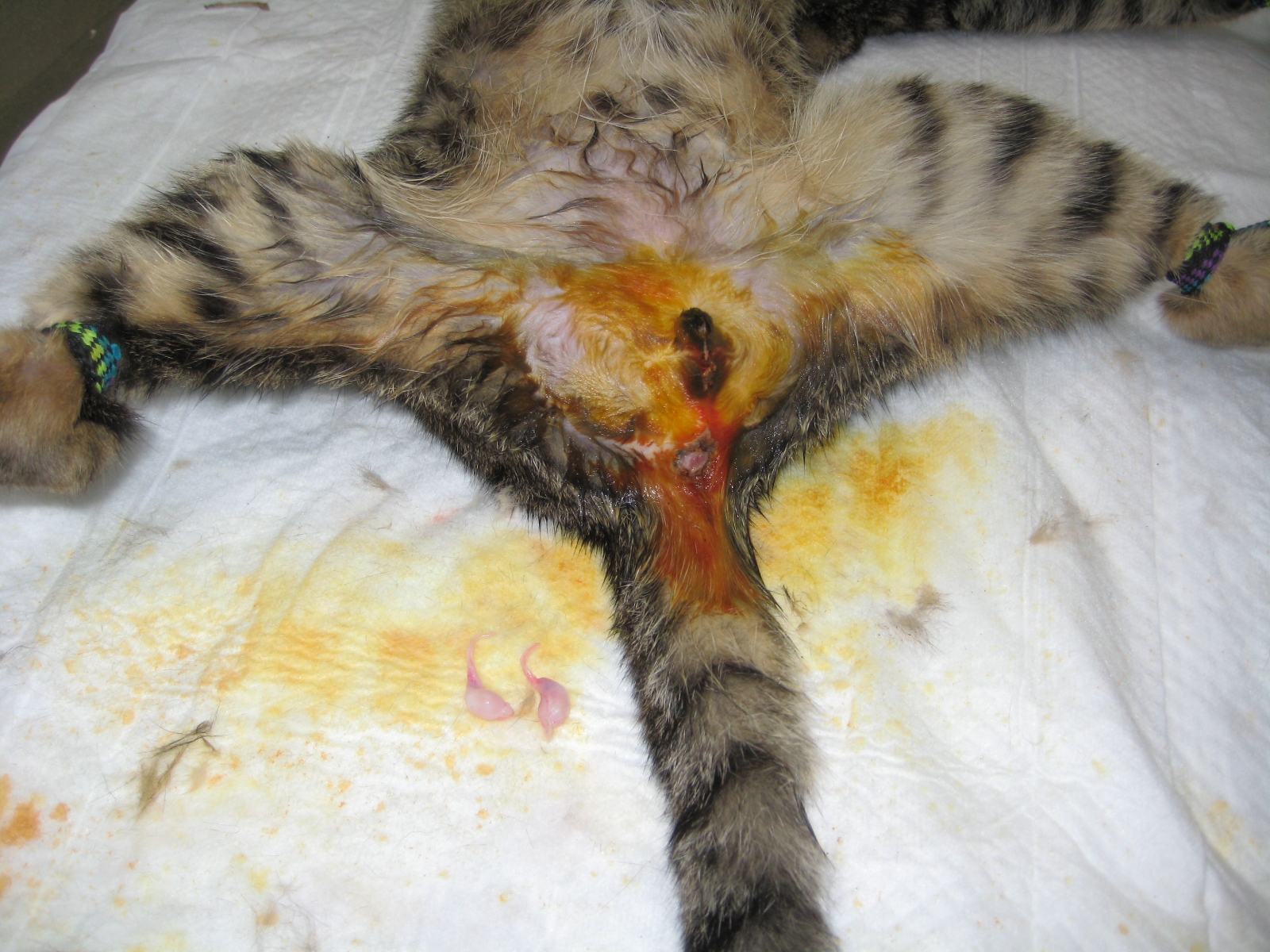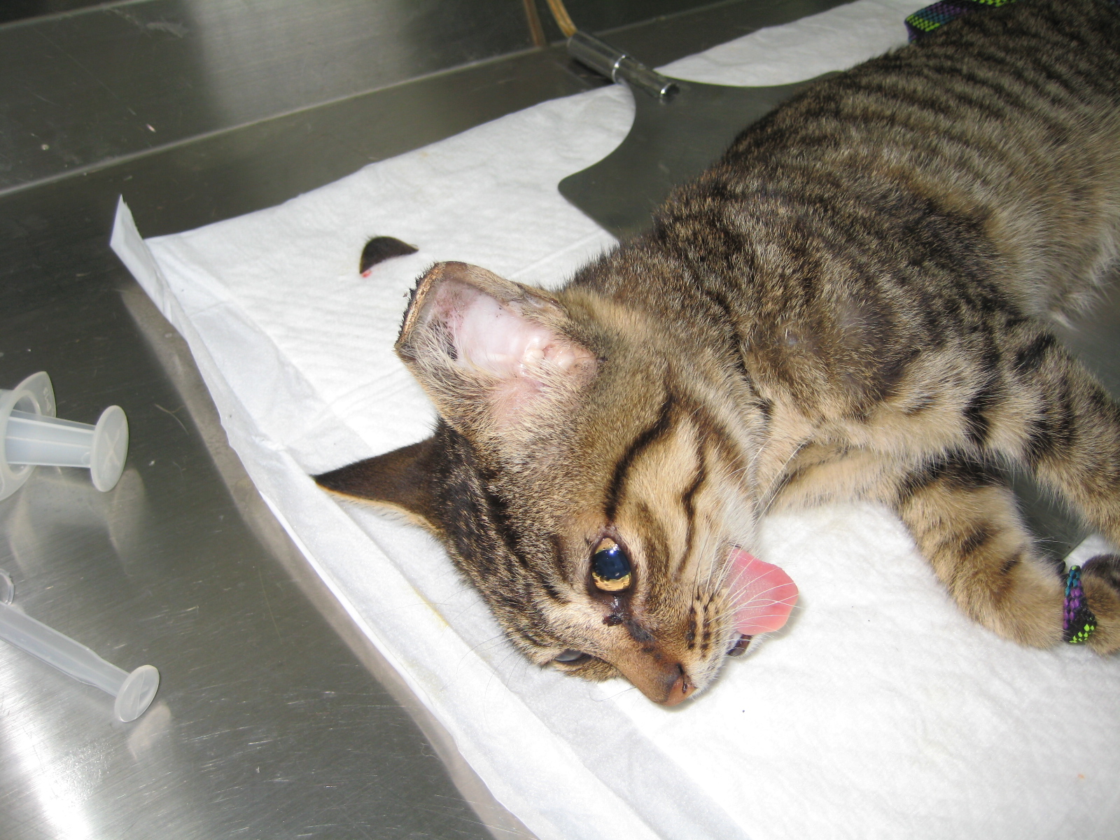 那邊的貓咪都有上呼吸道感染的問題,而且滿身的跳蚤,造成好幾隻貓有明顯的皮膚問題,其中一隻貓的嘔吐物發現,腸胃道裡有很多的蛔蟲,因此醫生為他們除蚤及做體內除蟲,希望他們放回時,是健健康康的。
