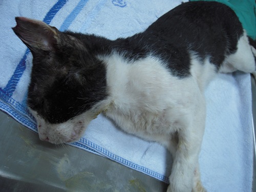 下巴及臉頰均有傷口並留出膿樣帶血分泌物 須進行傷口清洗並給予五天消炎藥 需醫藥費 350